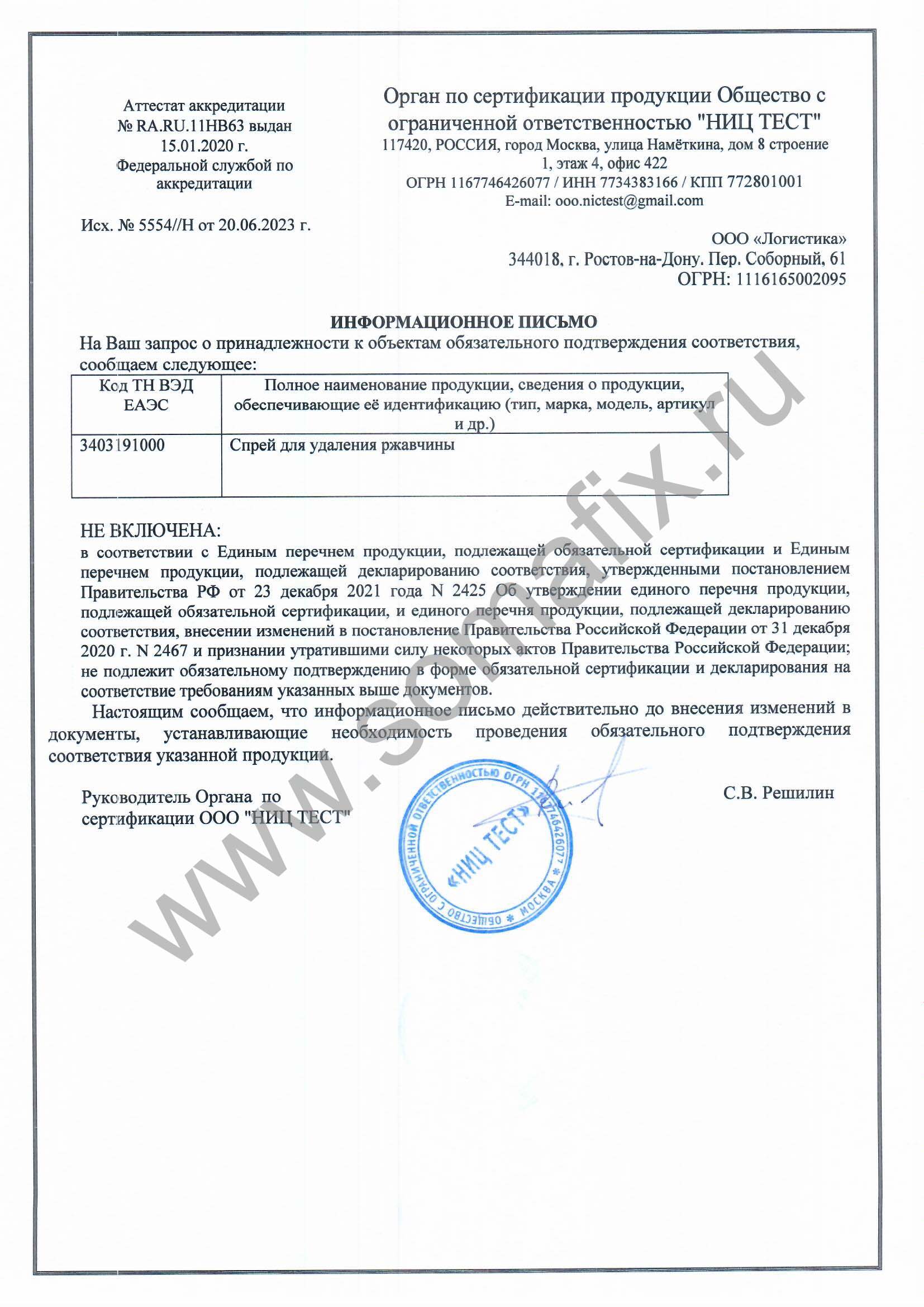 Спрей растворяет любые виды ржавчины. Благодаря содержанию MoS 2, предохраняет от повторного образования ржавчины и коррозии, защищает продукцию при хранении.